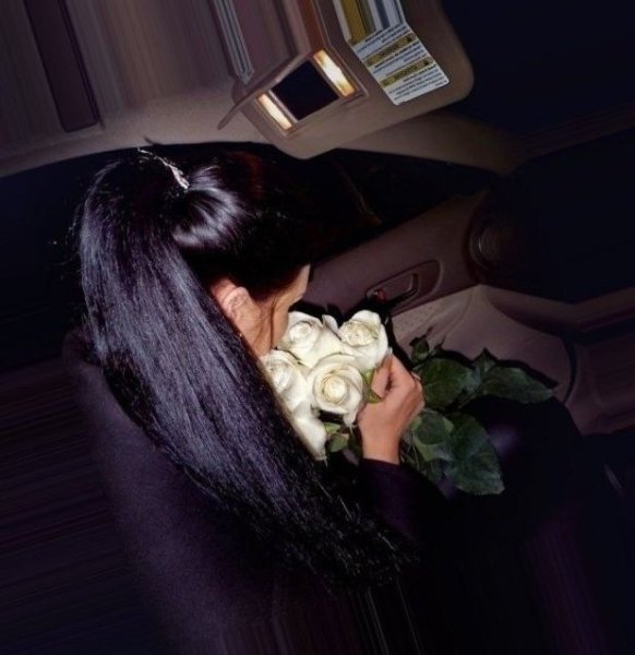 Загадочные силуэты девушки в автомобиле с букетом без лица в мягком свете. Мистическая атмосфера и элегантные детали подчёркивают романтику момента.