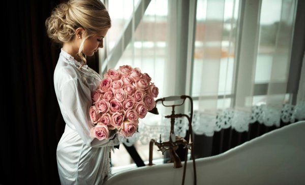 Представьте себе великолепную картину: женщина, обращенная к нам спиной, держит в руках прекрасный букет цветов. Ее силуэт отчетливо виден на фоне яркого заката или пышного сада. Цветы, разных оттенков и размеров, создают магическую атмосферу и наполняют его удивительным ароматом. Изящные лепестки словно танцуют в воздухе, освещенном теплыми лучами солнца. Созерцая эту картину, мы не можем устоять перед ее красотой и эмоциональной глубиной. Она переносит нас в мир чувственности, нежности и радости от жизни.