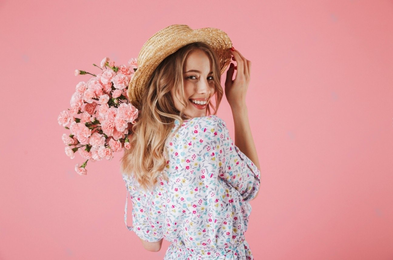 ![Счастливая девушка с цветами]()