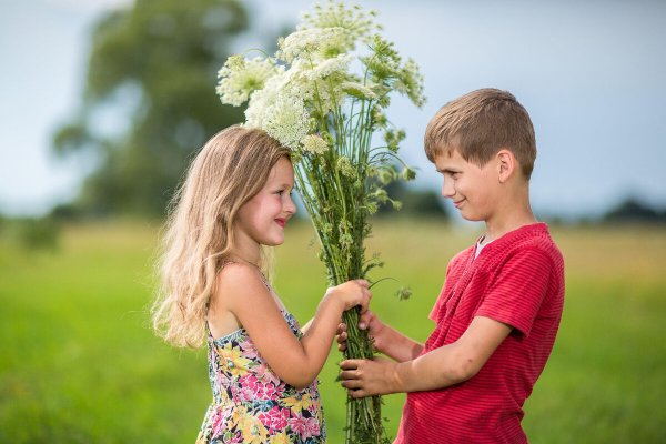 ![Мальчик дарит девочке цветочек]()