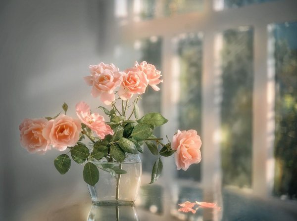 Розы в вазе на окне