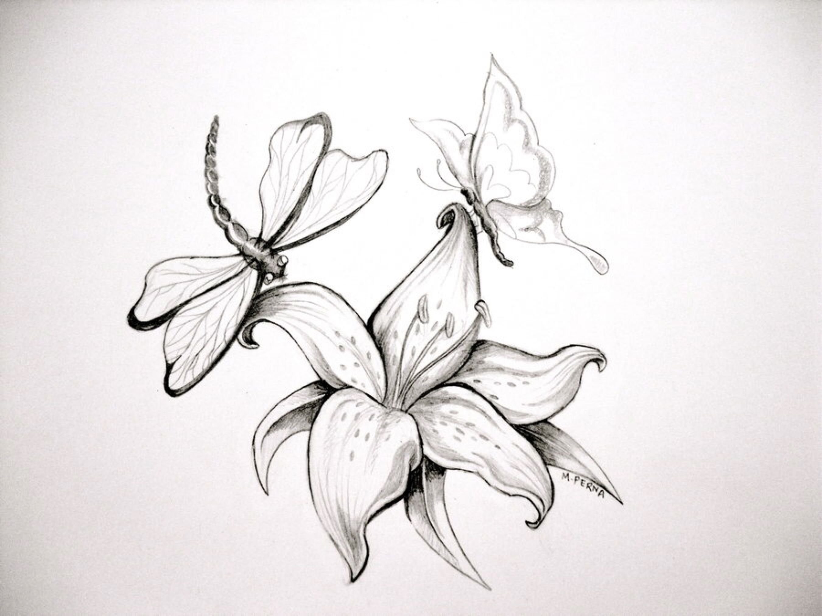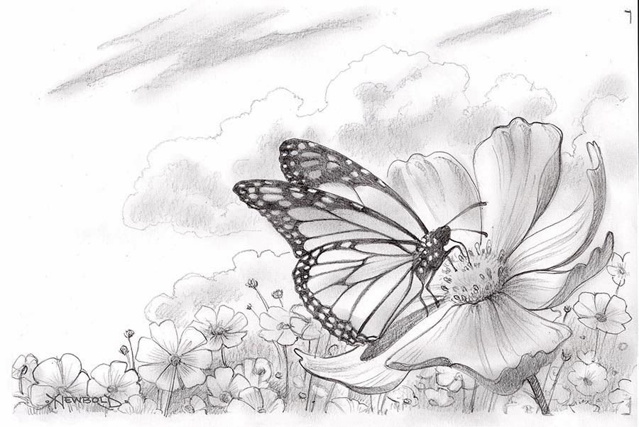 Бабочка на цветке карандашом