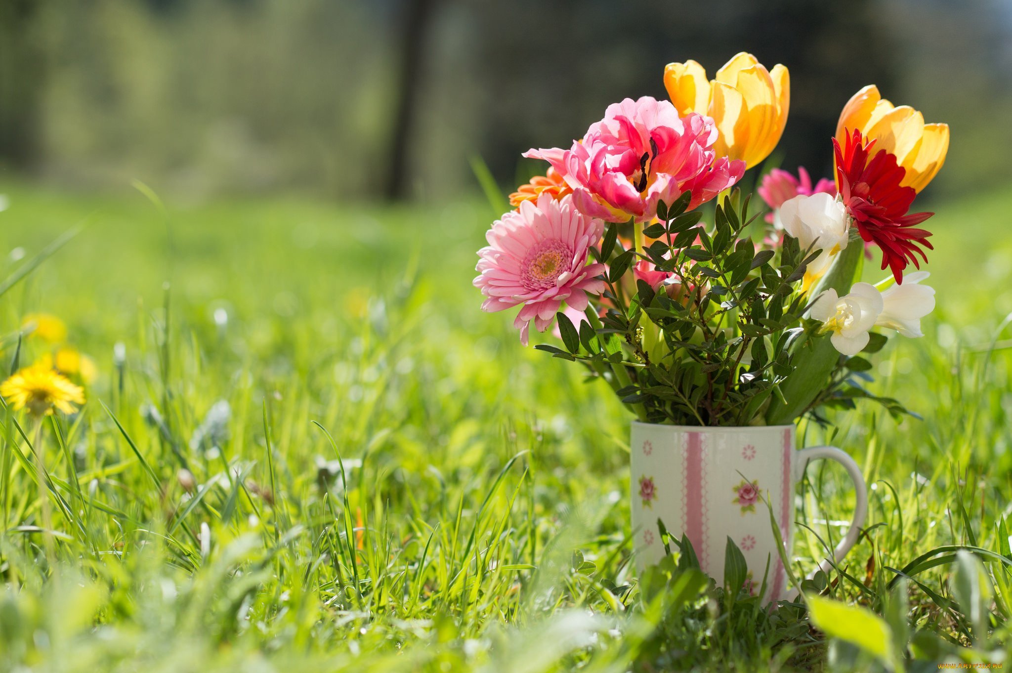 ![Букет цветов на природе]()