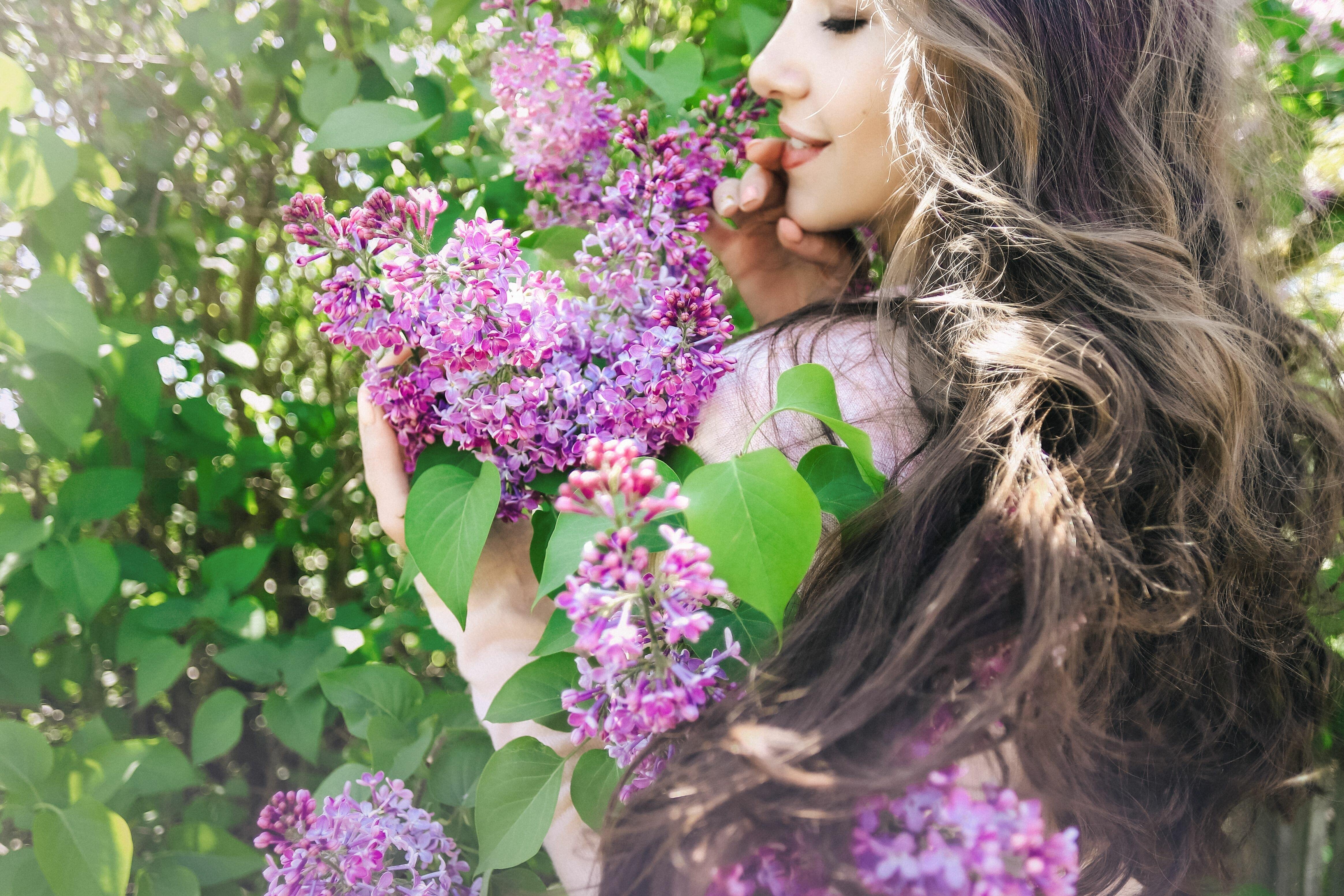 Девушка нюхает цветы в саду