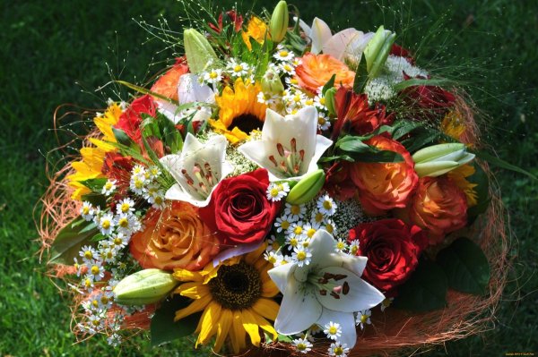![Букет лилии розы ромашки]()