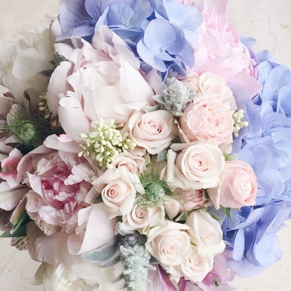 ![Пионовидные розы и гипсофилы]()