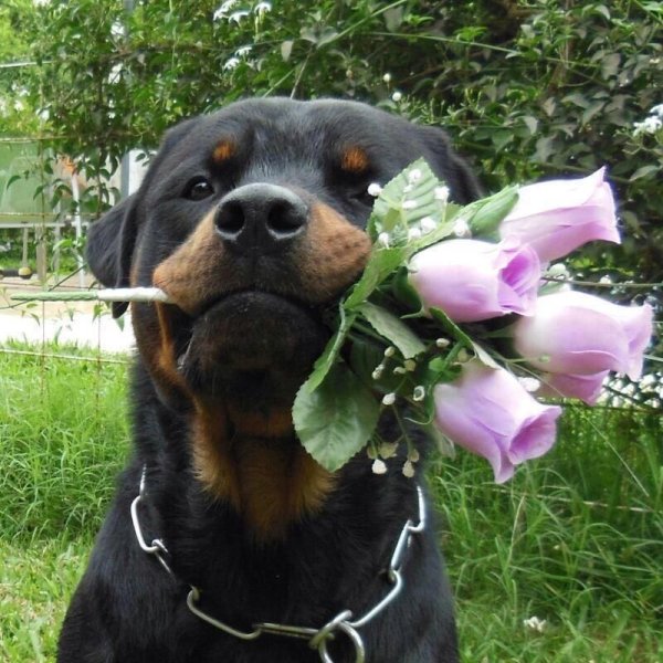 ![Ротвейлер с цветком]()