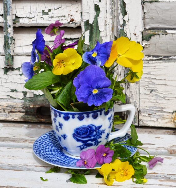 ![Анютины глазки в чашке]()