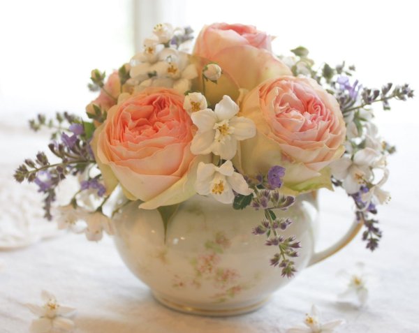 ![Нежный букет в чашке]()