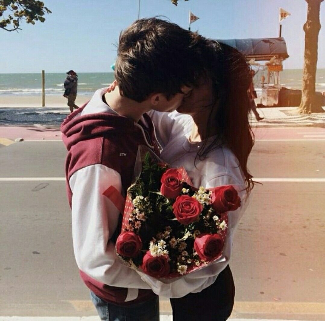 ![Влюбленные с цветами]()