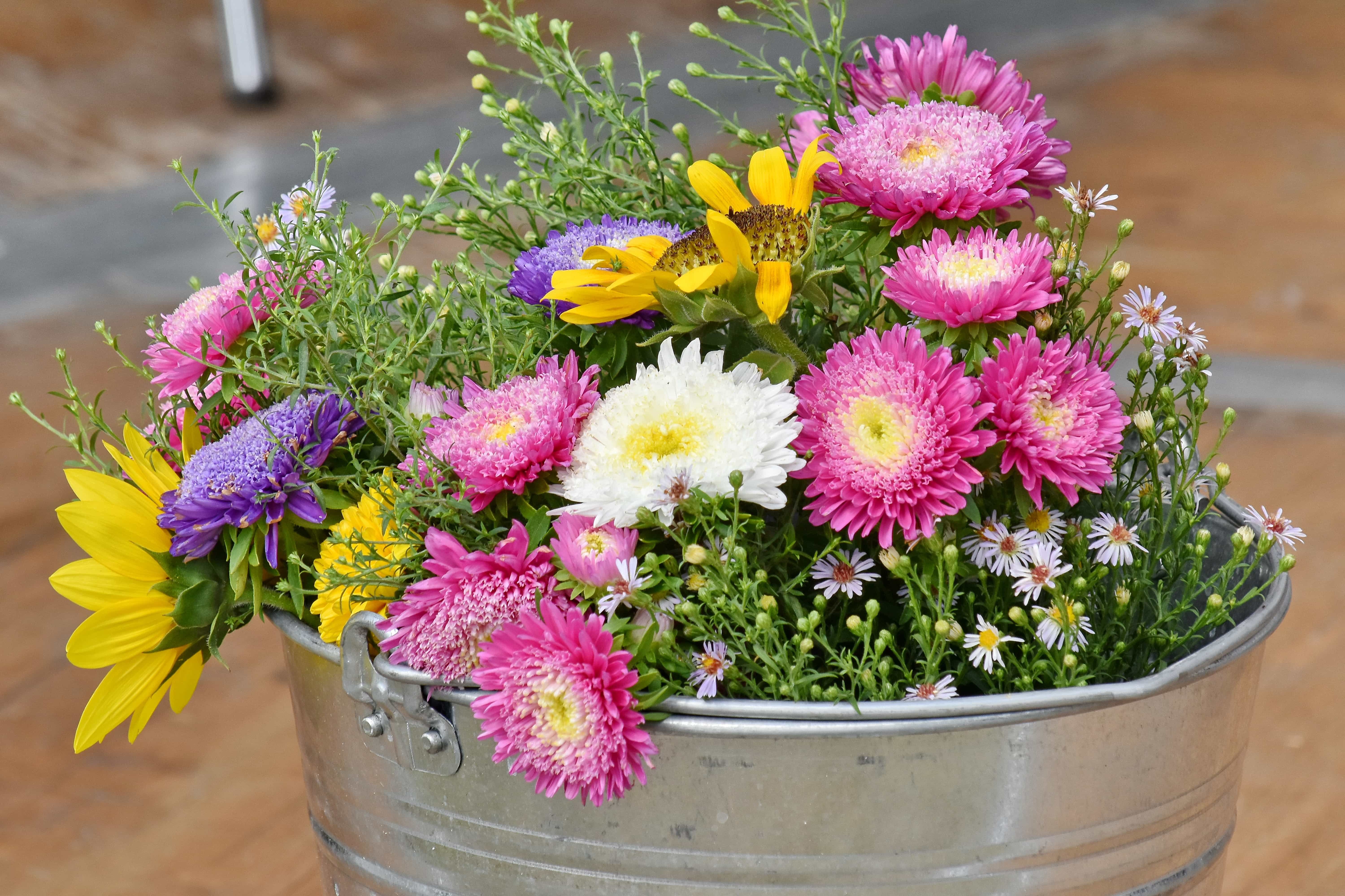 Красивые цветы в ведре