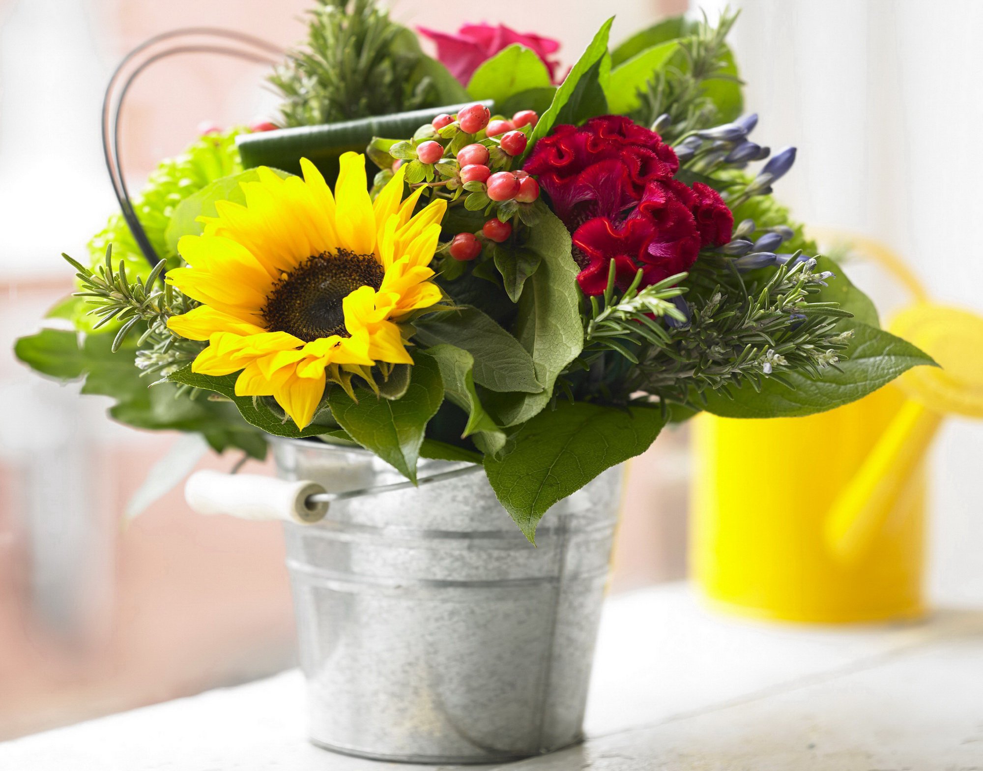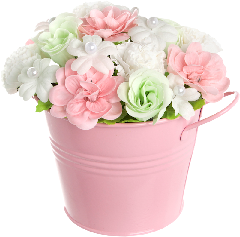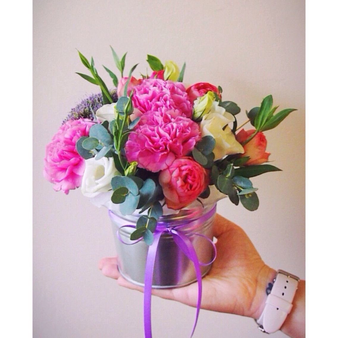 ![Букет цветов в ведёрке]()