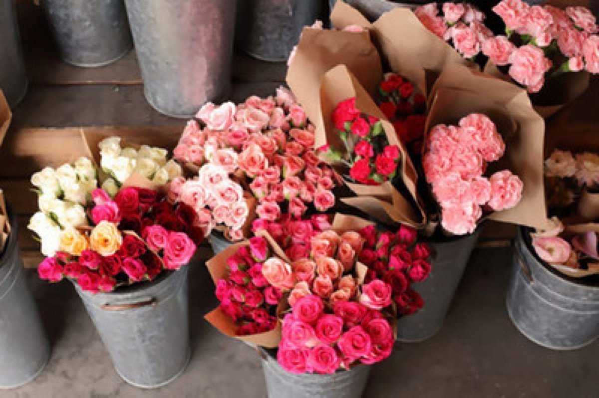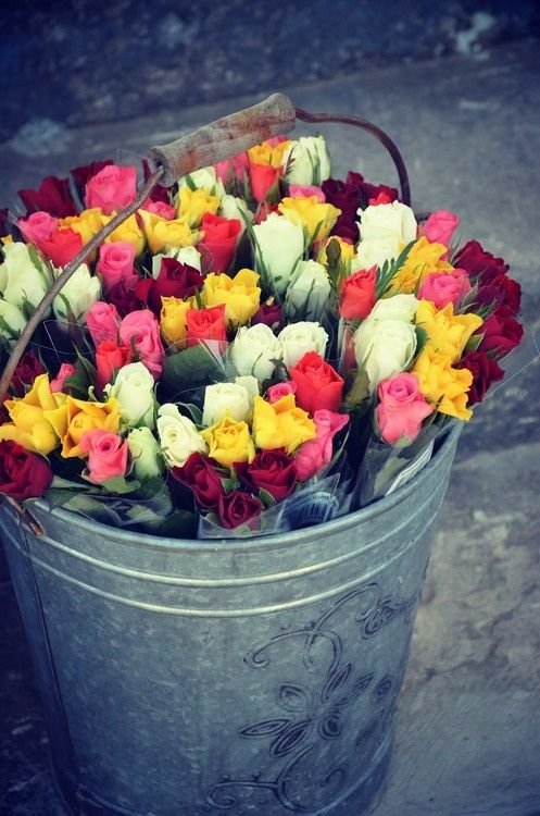![Букет роз в ведре]()
