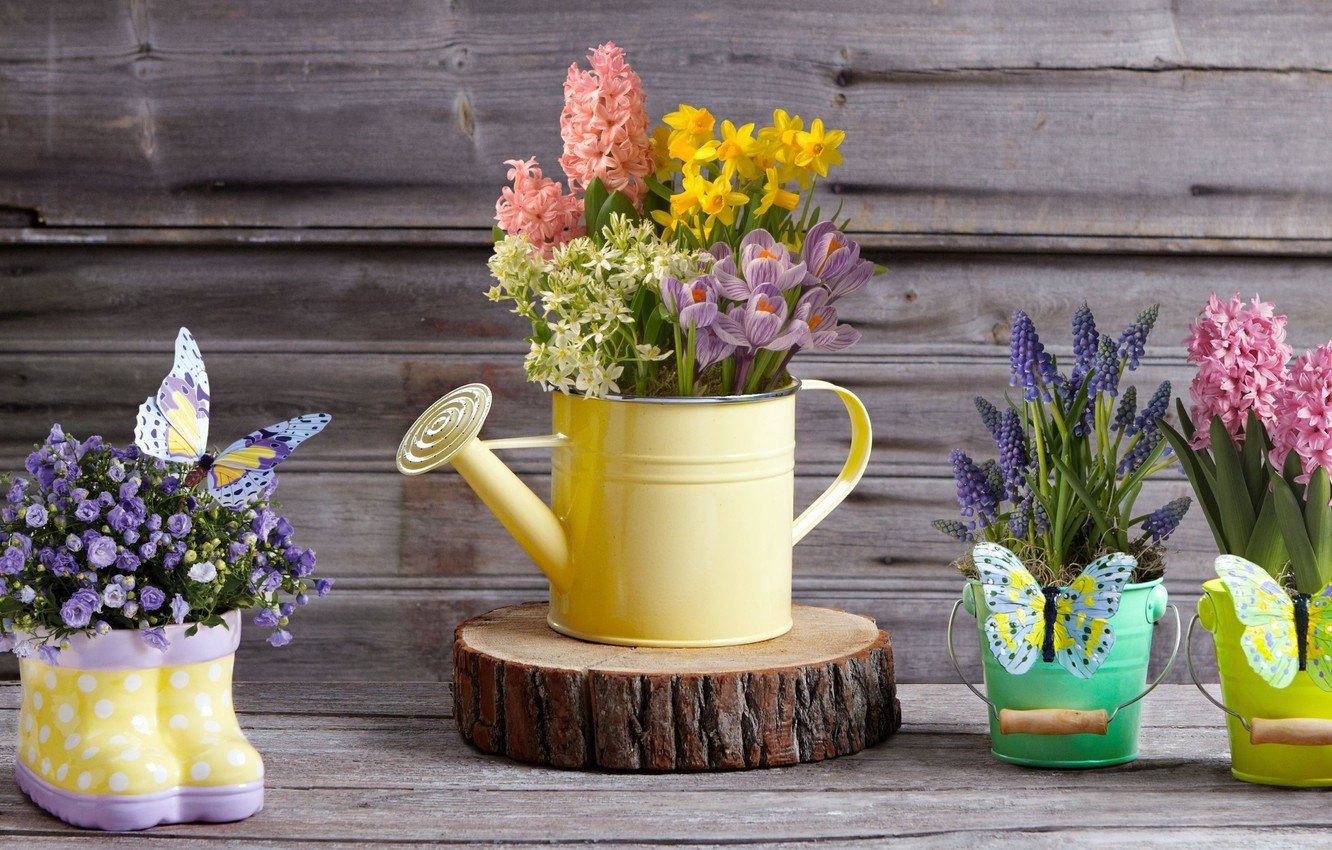 ![Красивые цветы в ведре]()