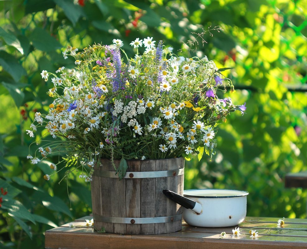![Полевые цветы в ведре]()