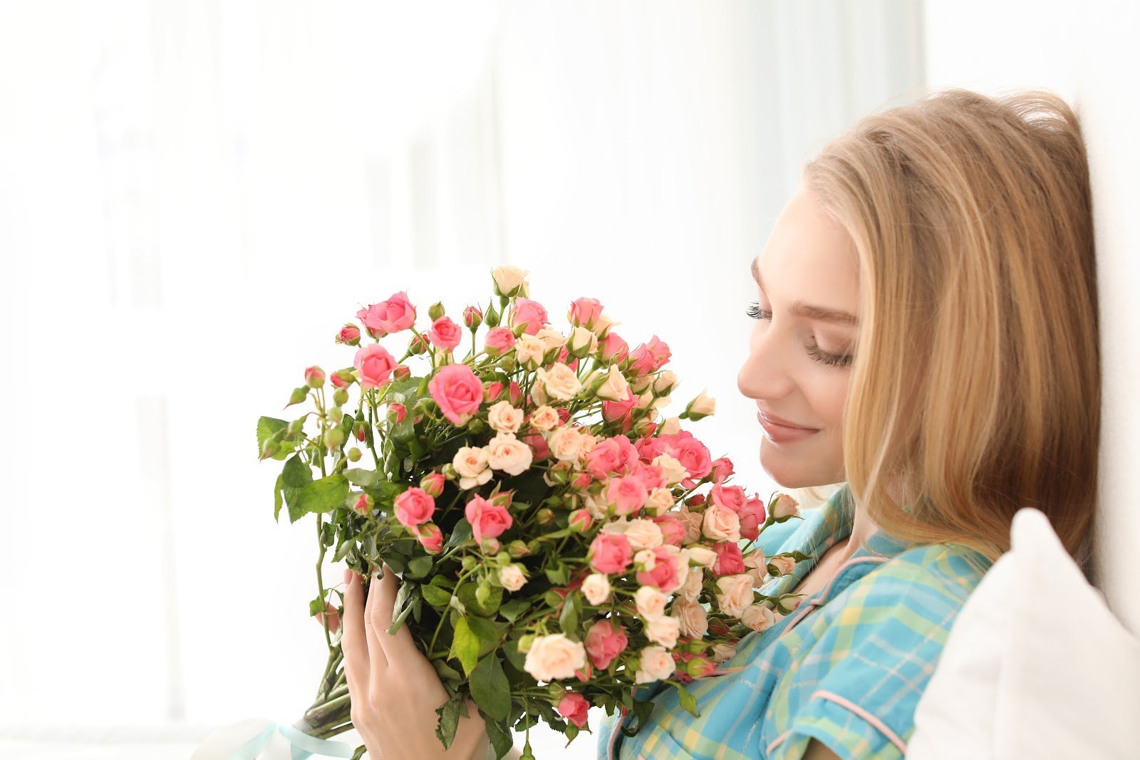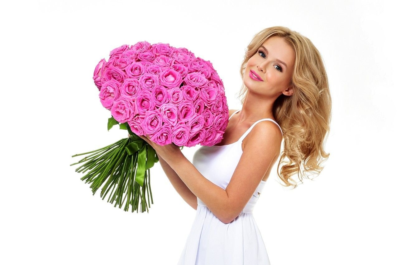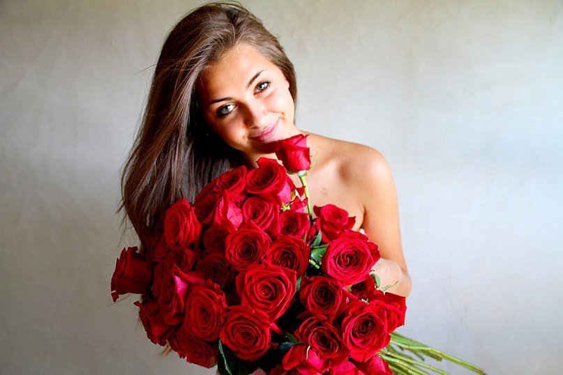 ![Девушка с букетом роз]()