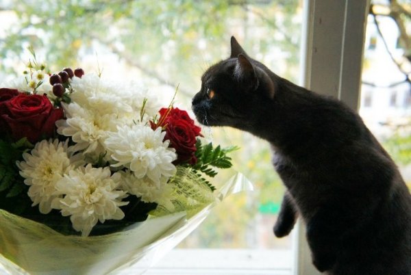 ![Кот с цветами в лапах]()
