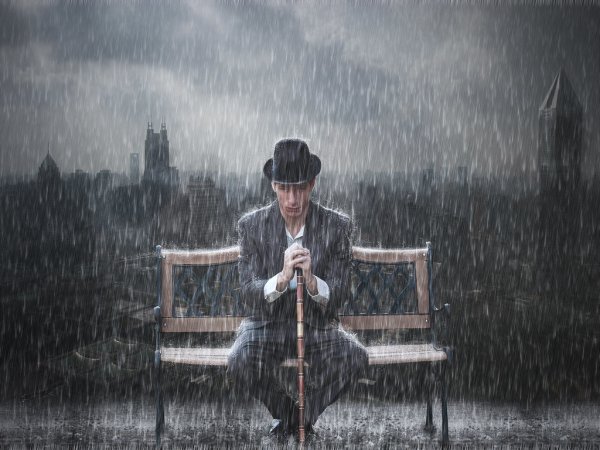 ![Грустный человек под дождем]()