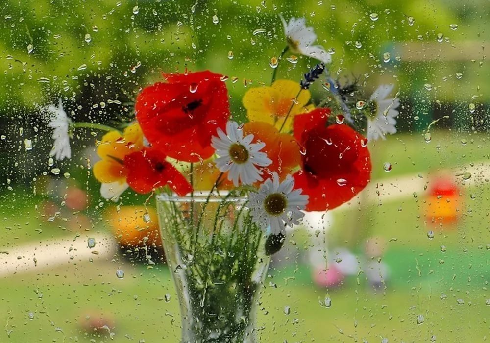 ![Цветы на фоне дождя]()