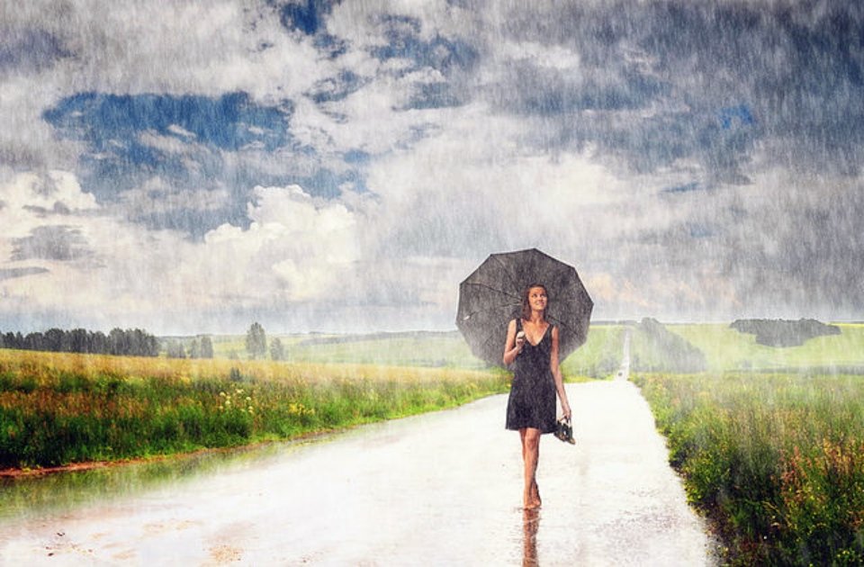 ![Прогулка под дождем летом]()