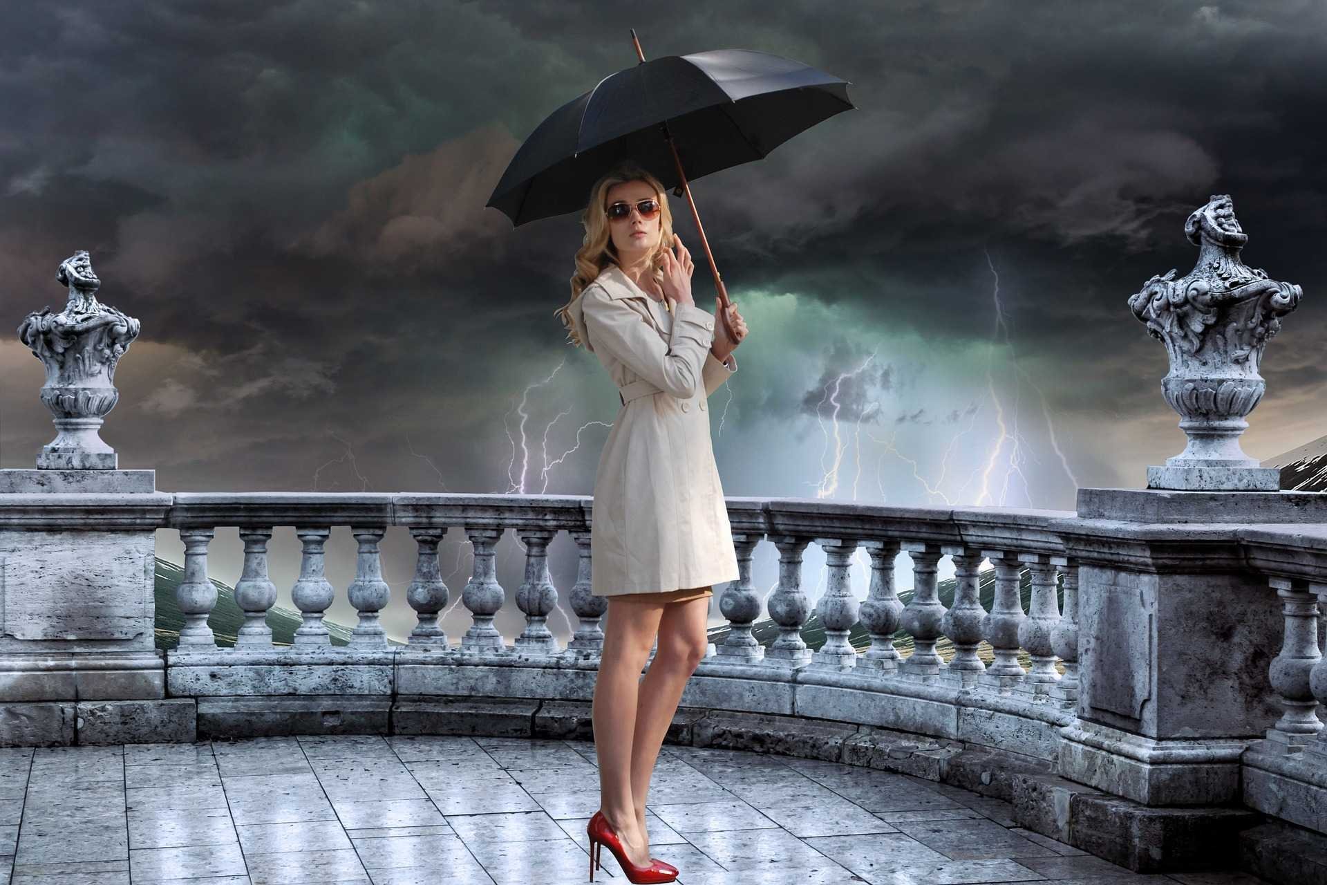 ![Женщина с зонтиком под дождем]()