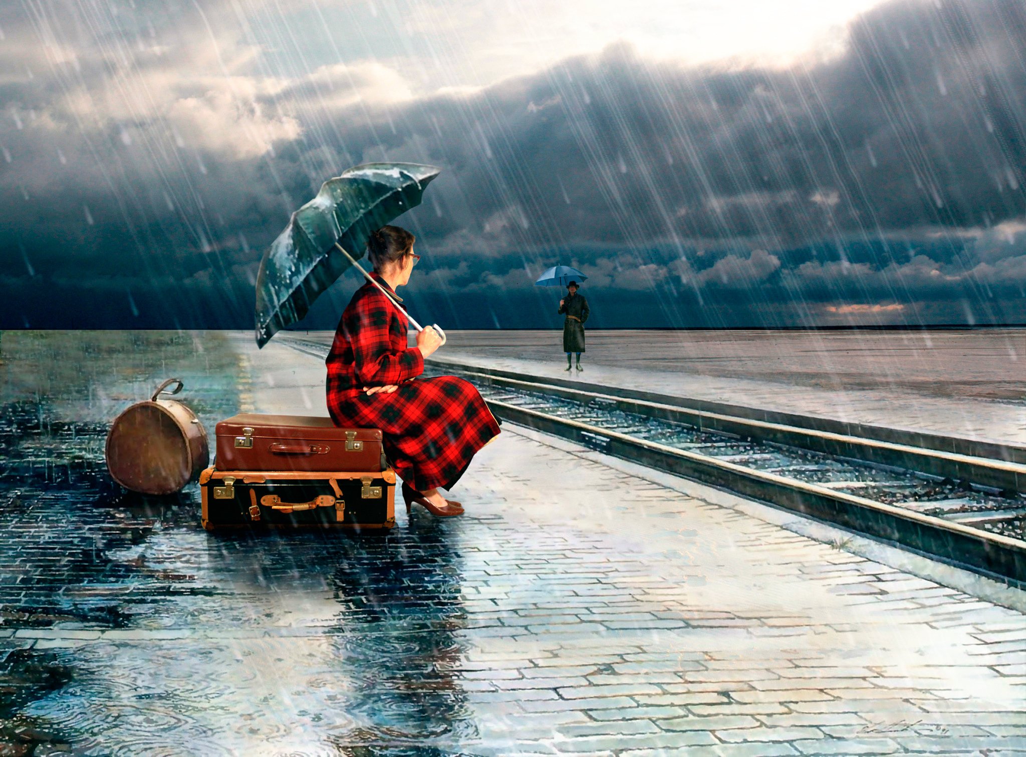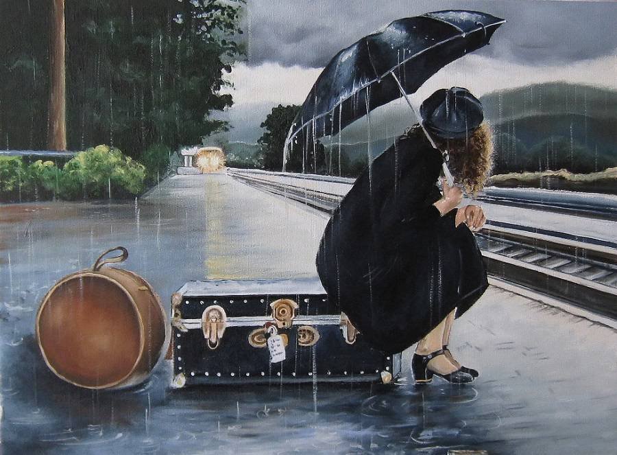 ![Девушка на вокзале под дождем]()