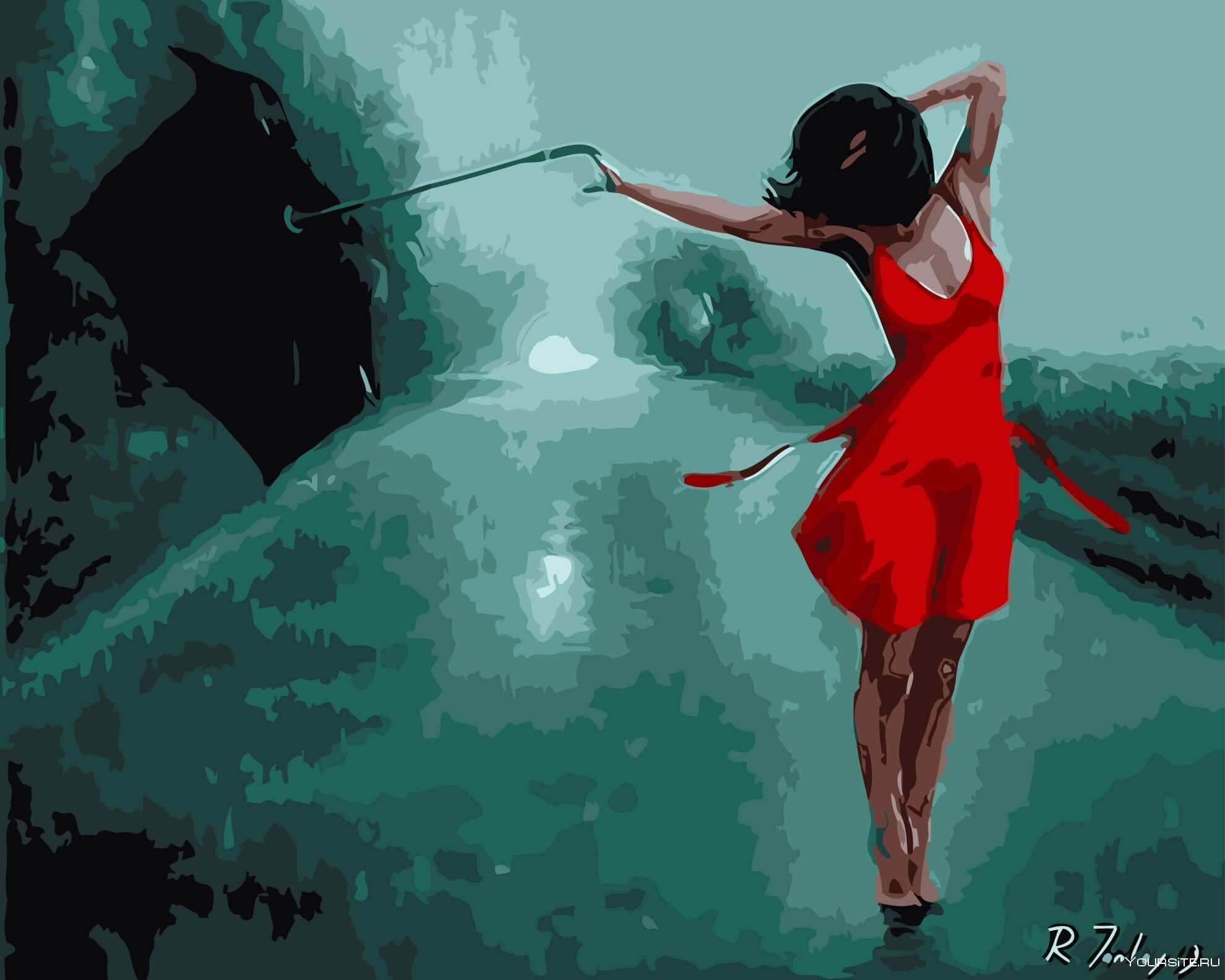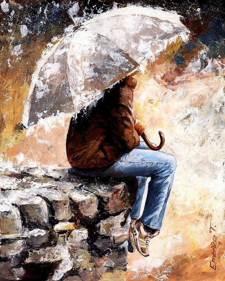 ![Картина девушка с зонтом под дождем]()
