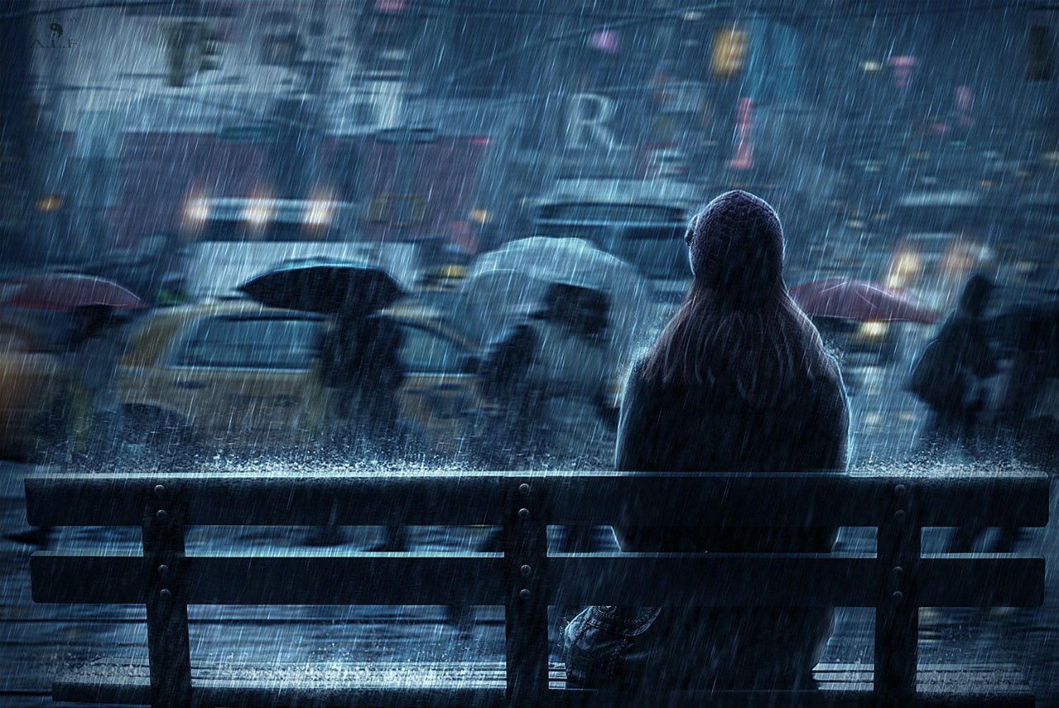 Одинокая девушка под дождем