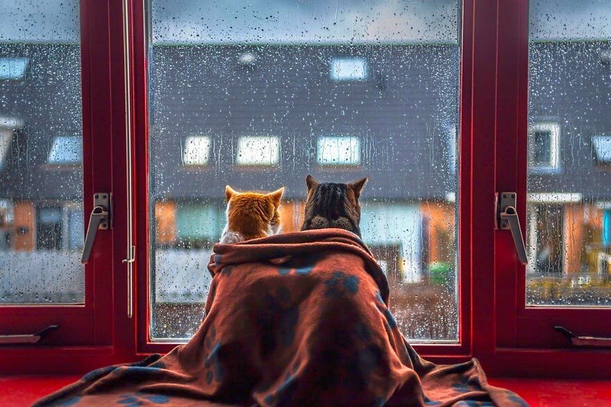 ![Кот под дождем за окном]()
