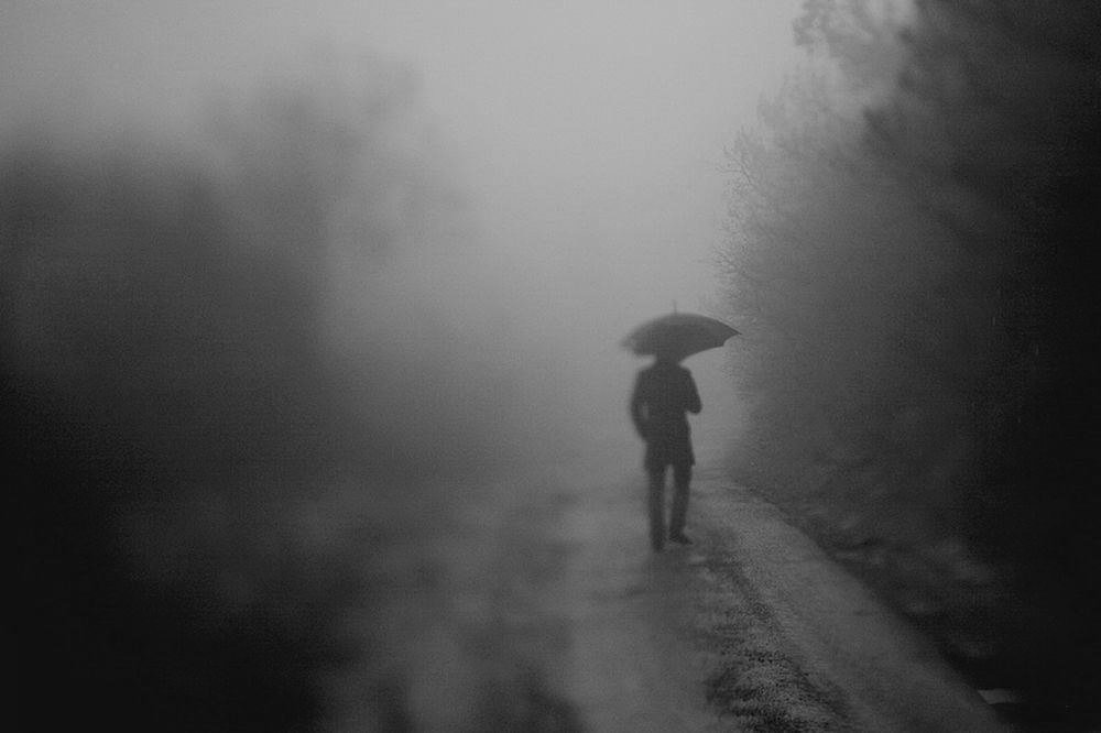 ![Человек с зонтом в тумане]()