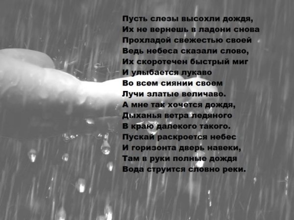 Вашему вниманию представляются красивые картинки, на которых изображены дождь и стихи. Эти изображения позволят вам окунуться в атмосферу таинственности и романтики, создаваемую этой природной явью. Они переносят нас в мир, где каждая капля дождя становится символом чувств и эмоций, заключенных в потоке слов. На этих картинах сочетаются красота природы и искусства, оставляя ощущение великой силы и глубины. Приглашаем вас насладиться магией дождя и поэтическими произведениями, чтобы украсить ваш день и вдохновиться новыми мыслями и эмоциями.