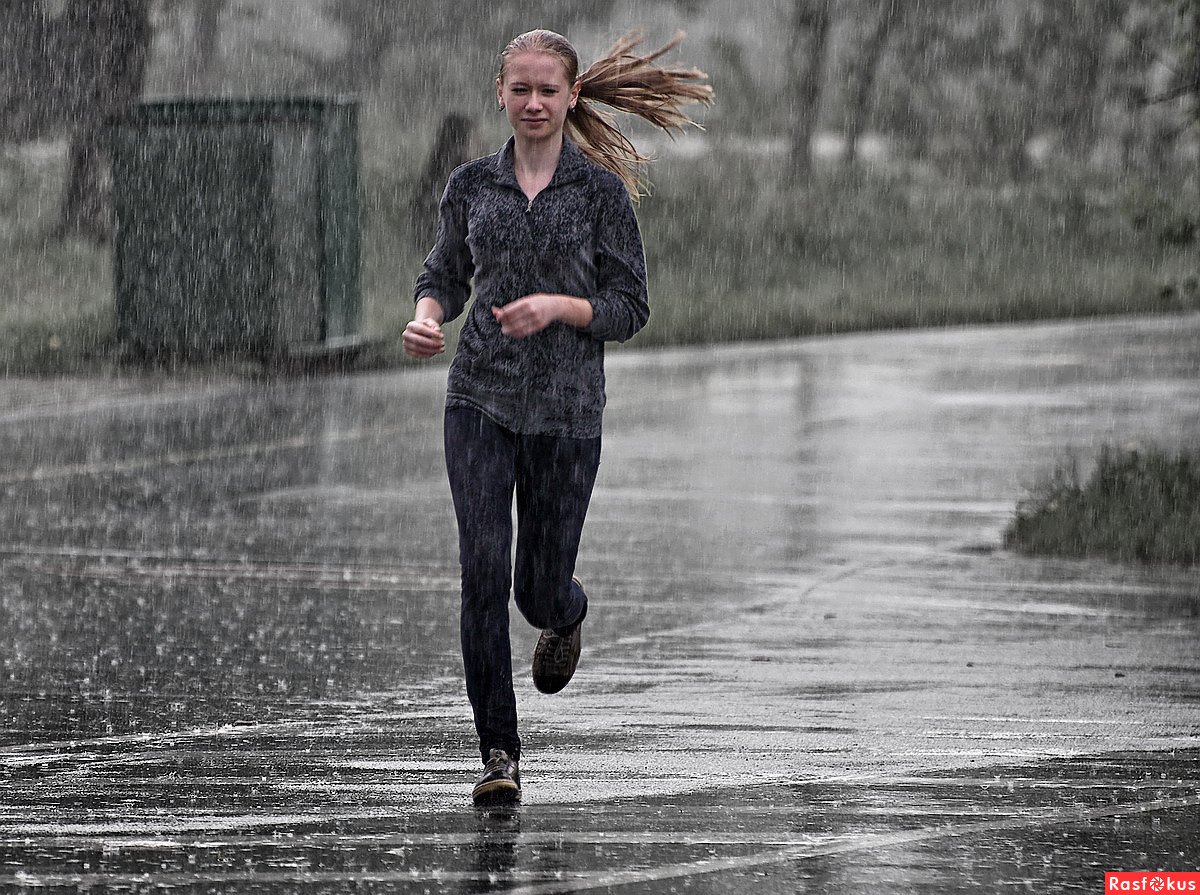 Человек бежит под дождем
