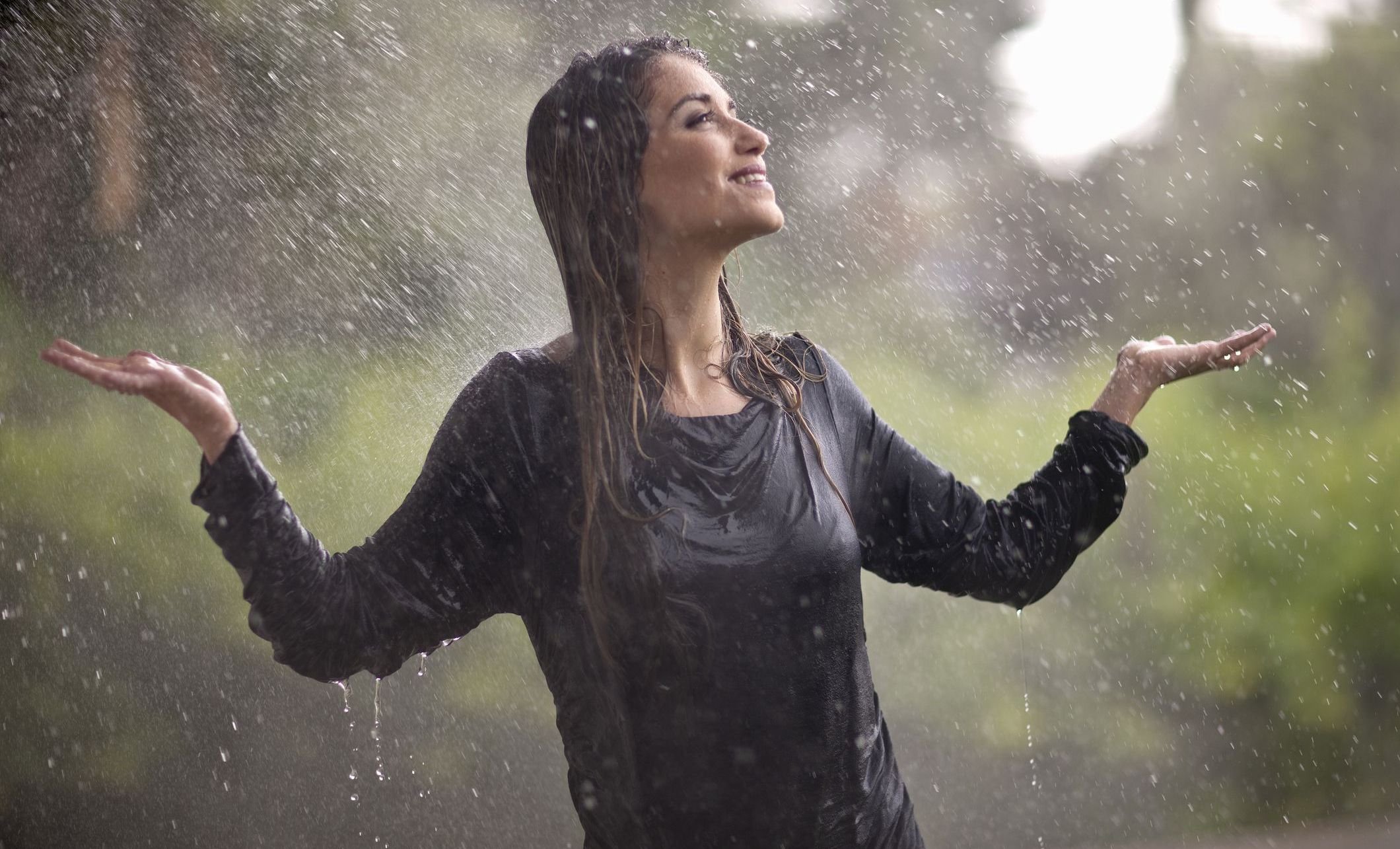 ![Счастливая девушка под дождем]()