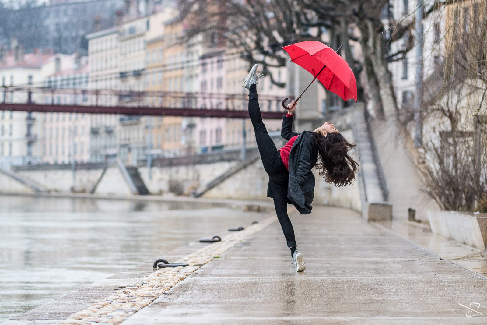 ![Красный зонт на мосту]()