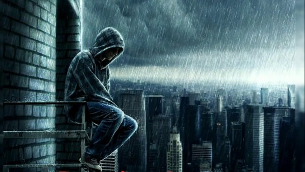 ![Парень в капюшоне дождь]()