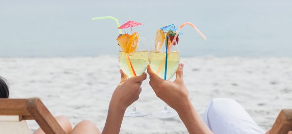 ![Девушка с коктейлем на пляже]()