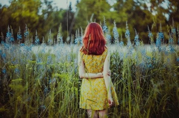 Рыжая девушка в поле со спины