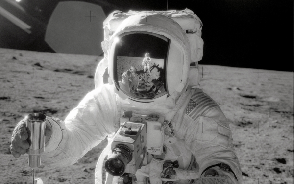 ![Нил Армстронг и Эдвин Олдрин на Луне]()