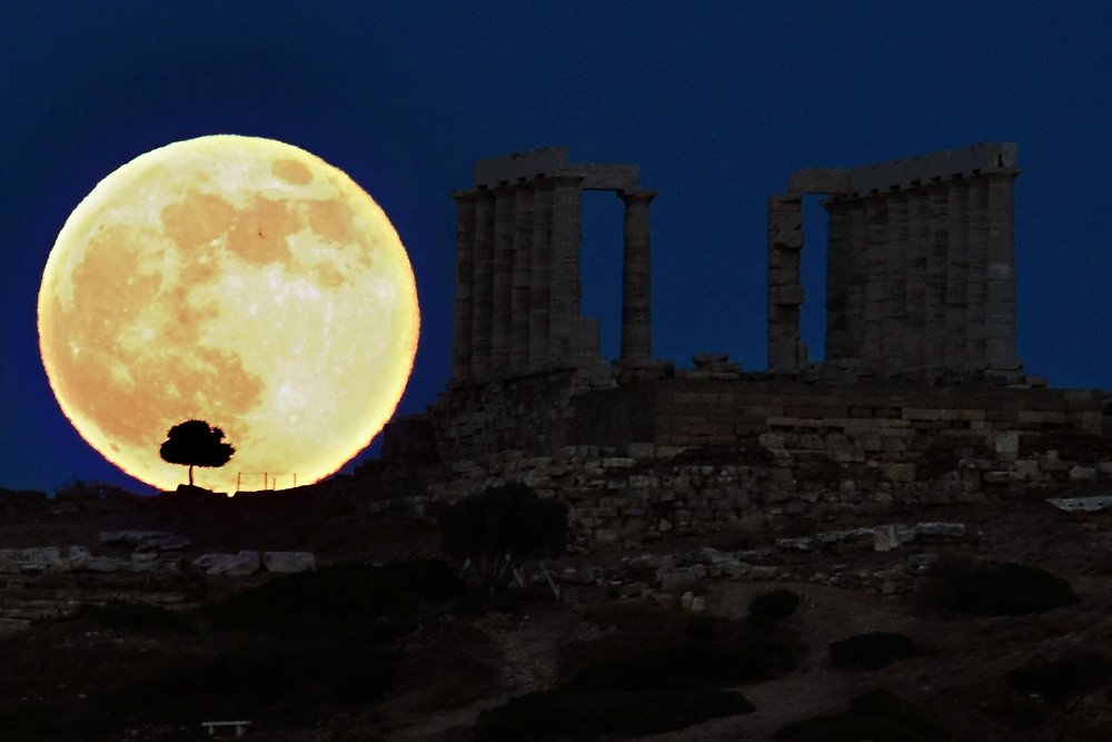 ![Храм Посейдона на мысе Сунион в полнолуние]()