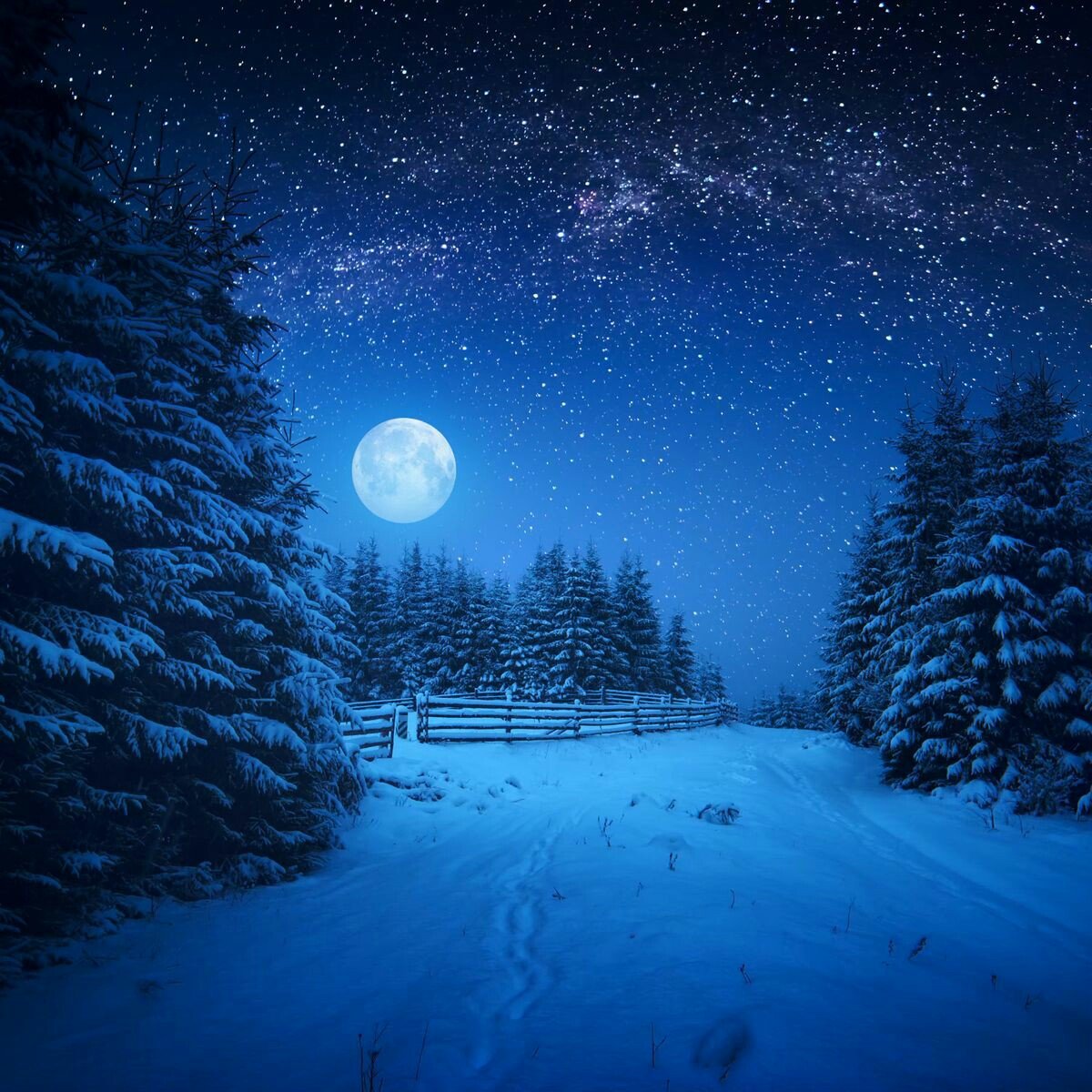 ![Снежный лес ночью]()