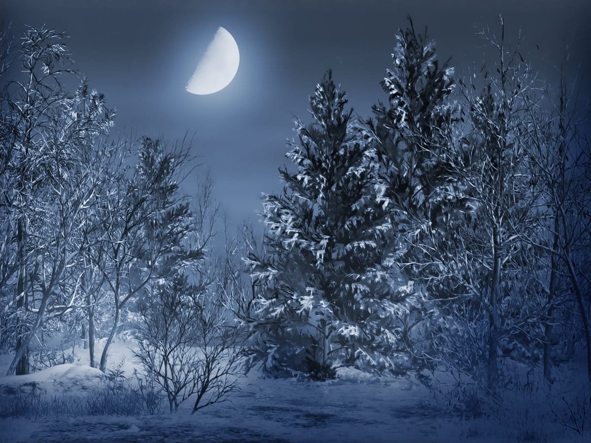Ночной лес с луной зимой