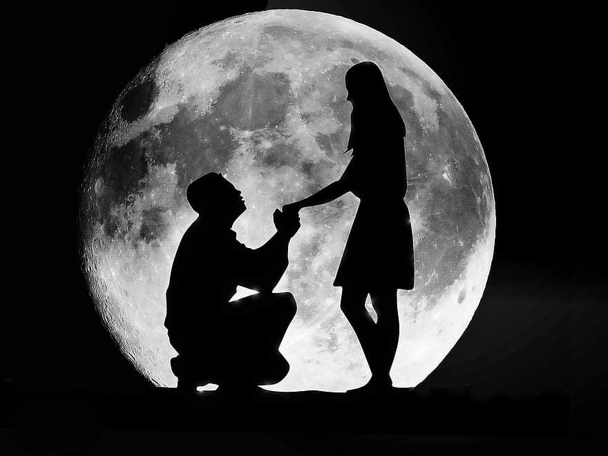 ![Влюбленная пара на фоне Луны]()
