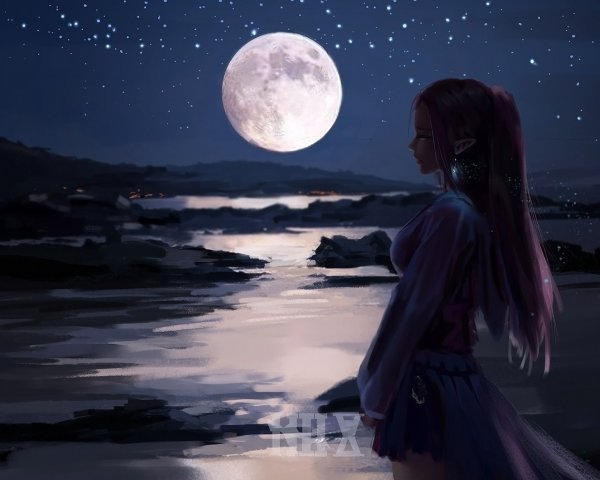 На картинке изображена одинокая девочка, стоящая под яркой луной. Ее фигура выделяется на фоне темного неба, в котором светит полная луна. Взгляд девочки устремлен вверх, словно она задумчиво размышляет о чем-то важном. Атмосфера таинственности и загадочности окутывает этот образ, придавая ему особую загадочность и привлекая внимание зрителя.