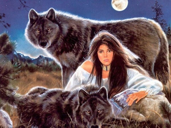 ![Девушка с волками в полнолуние]()