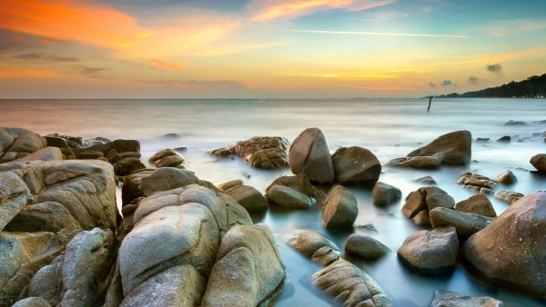 ![Закат море галька]()
