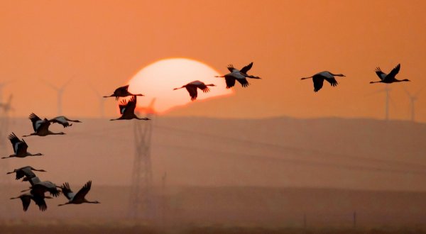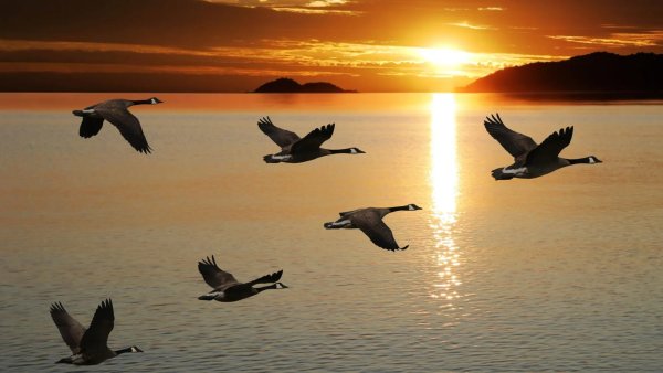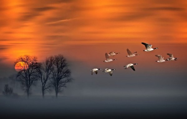 На картине изображено удивительное зрелище: стая птиц, словно темные точки на ярком холсте неба, стремительно улетает прочь за горизонт, погружаясь в бескрайнее синее море. Их крылья мелькают, создавая эффект движения и свободы, а контраст цветов лишь подчеркивает красоту этого момента природы. Взгляд замирает, следуя за каждым птичьим силуэтом, и душа наполняется чувством легкости и величия мира вокруг.