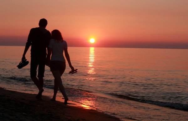 ![Пара на берегу моря на закате]()
