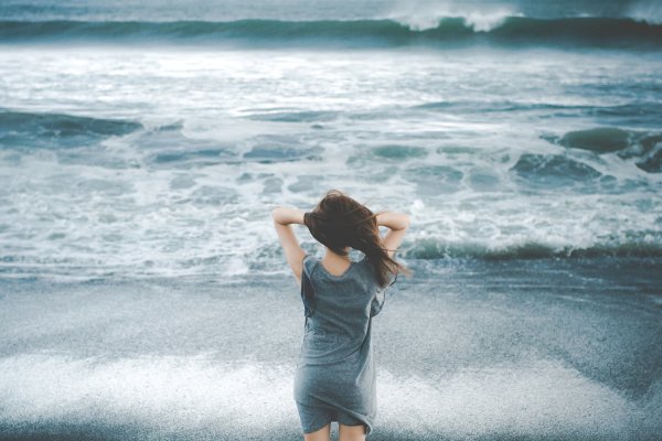 На картинке изображена девочка, стоящая на берегу моря. Ее волосы развеваются на ветру, а взгляд устремлен вдаль, к бескрайнему горизонту. Фон состоит из нежных оттенков голубого неба и глубокого синего моря, создавая атмосферу умиротворения и спокойствия. Девочка, одетая в легкое платье, словно тает в окружающей среде, будто она сама является частью этой природной красоты. На заднем плане виднеются играющие волны и далекие контуры горизонта, придающие картине загадочность и загадочную привлекательность.