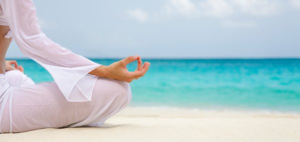 ![Красивая медитация на берегу океана]()