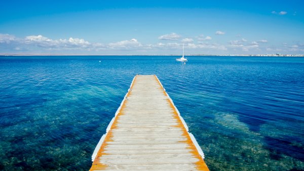 На картинках изображено узкое море, окруженное многочисленными холмами и скалами. Бирюзовая вода привлекает внимание своей кристальной чистотой, отражая яркое солнце на своей поверхности. Вдали виднеется горизонт, скрытый туманом, создающим атмосферу загадочности и таинственности. Пейзаж наполнен спокойствием и умиротворением, приглашая зрителя погрузиться в атмосферу уединения и красоты природы.